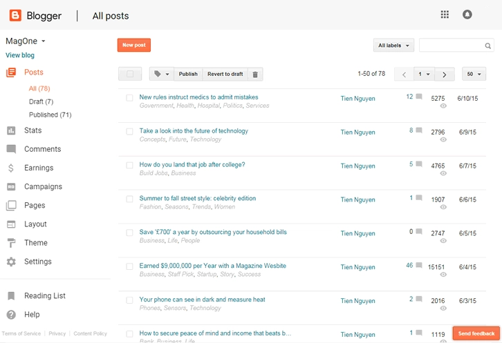 Decidi criar uma conta no Blogspot, que hoje conhecemos como Blogger. A plataforma era super intuitiva e, acredite se quiser, tudo era de graça! Tinha várias funcionalidades úteis que funcionavam muito bem, como a "Newsletter" e a seção de "Posts mais vistos". O blog era bem simples, sem um design elaborado; eu usava o tema padrão do Blogger. Naquele momento, ainda não tinha comprado um domínio, pois não sabia se o projeto daria certo.